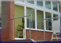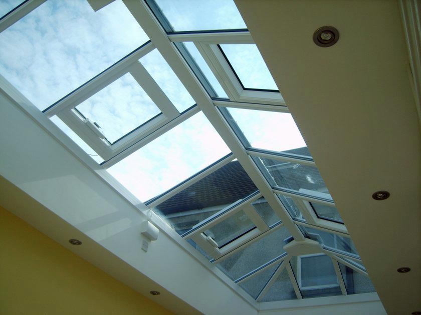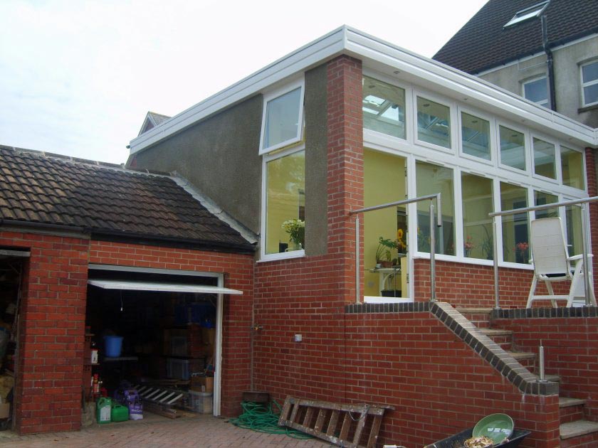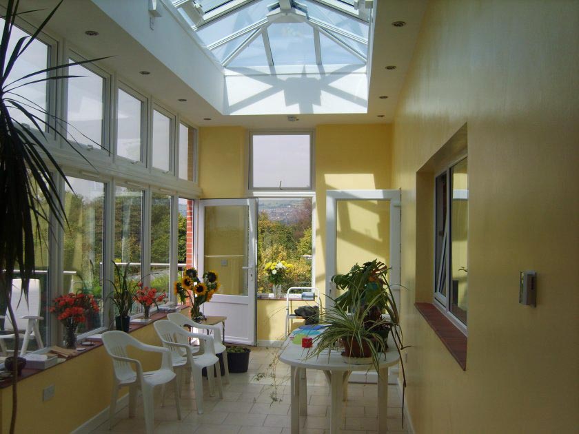The conservatory was demolished and replaced by a larger sun lounge comprising of a dwarf brick wall topped with two tiers of uPVC Double Glazed windows. Additional natural lighting was provided through the incorporation of a large glazed roof lantern set in the new flat roof.