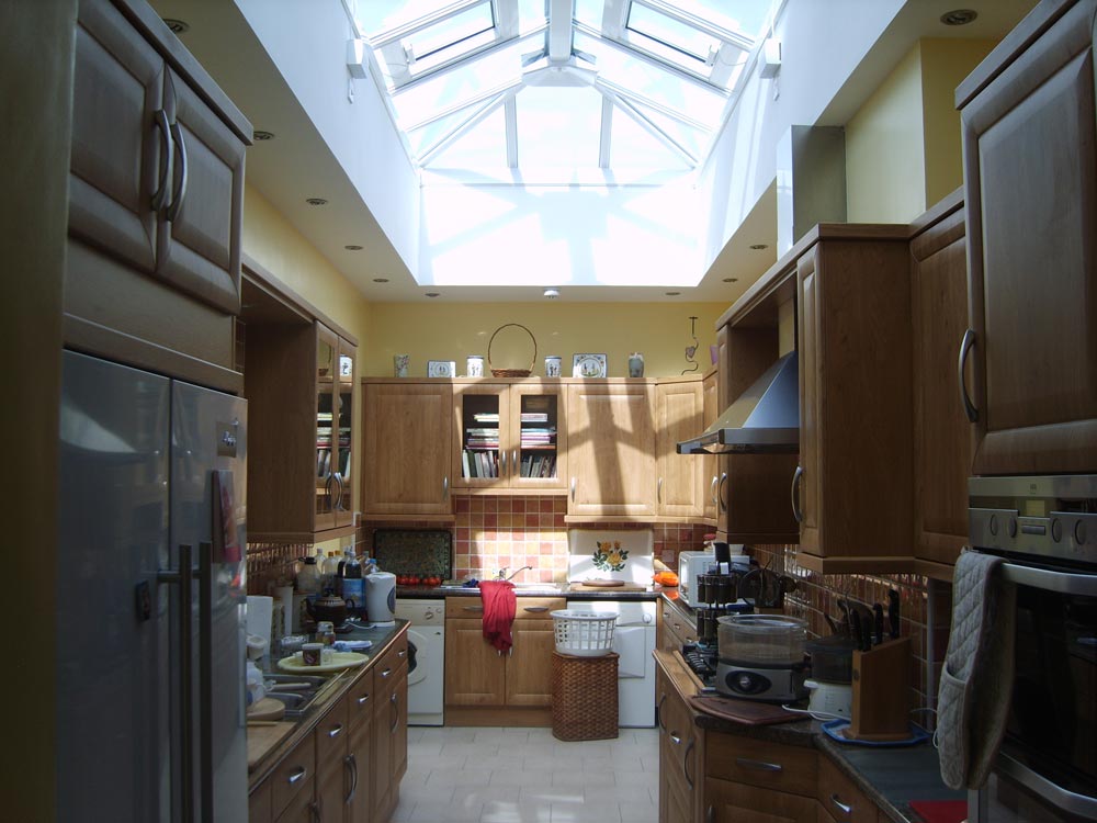The existing kitchen was stripped out, the external walls raised in height and a new flat roof was constructed. The floor level was raised, insulated and under-floor heating installed beneath a ceramic tile finish. To improve the natural light in the kitchen a large glazed roof lantern was also set in the new flat roof.